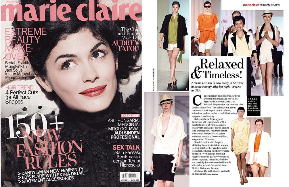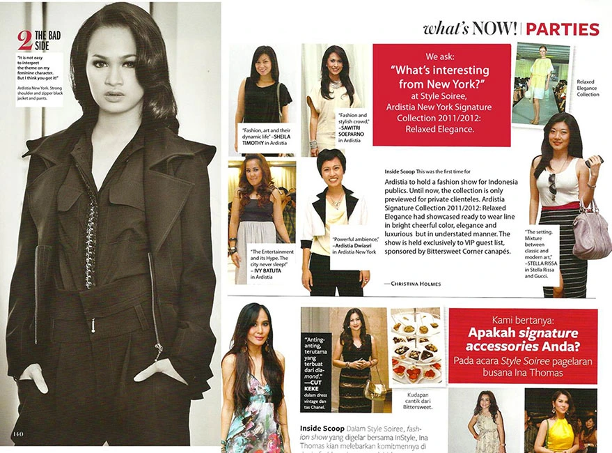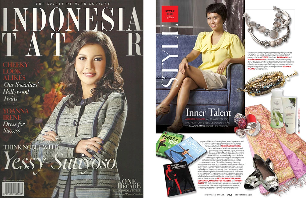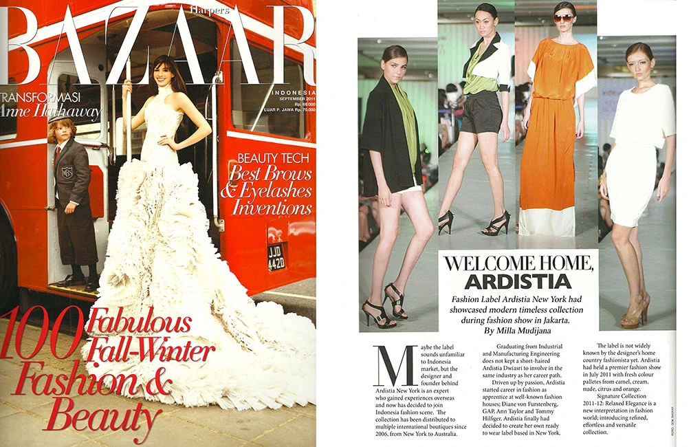 Ardistia was recently announced as a Finalist for Indonesia-Australia Center in 2014, a Nominee for the World Fashion Organization® and World Fashion Week® International, as official representative of Indonesia, February 2012, in the US, Asia, Europe. Also, as the winner of the “Are You Runway Ready” fashion contest by the Women’s Mafia, February 2010 and a finalist of Gen Art’s latest Fashion competition “Plastics Make it Possible” in January 2010. She received Honorable Mentions by London International Creative Competition in September 2009, announced as the winner of a Fashion Award from Biore / Gen Art in October 2007, profiled in WWD April 2007 issue for “New Designer to Watch” and received the ready to wear nomination from Gen Art Styles in May 2007, New York.
